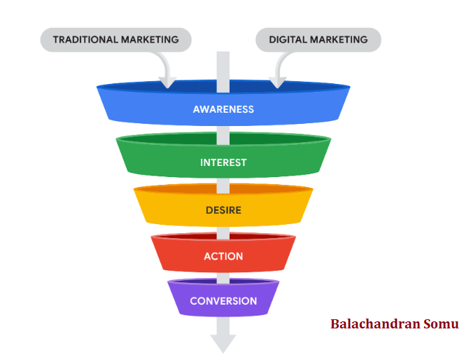 Funnel #3: Traditional vs. Digital Marketing (Awareness → Interest → Desire → Action → Conversion)